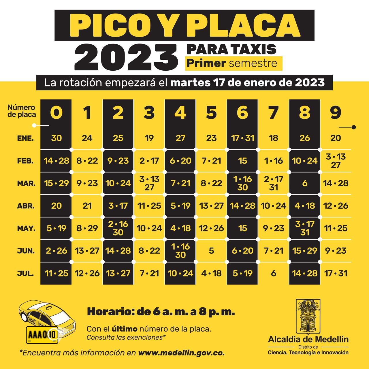 Para los taxis aplicará con base en el último dígito de la placa, con rotación cada dos semanas, así: