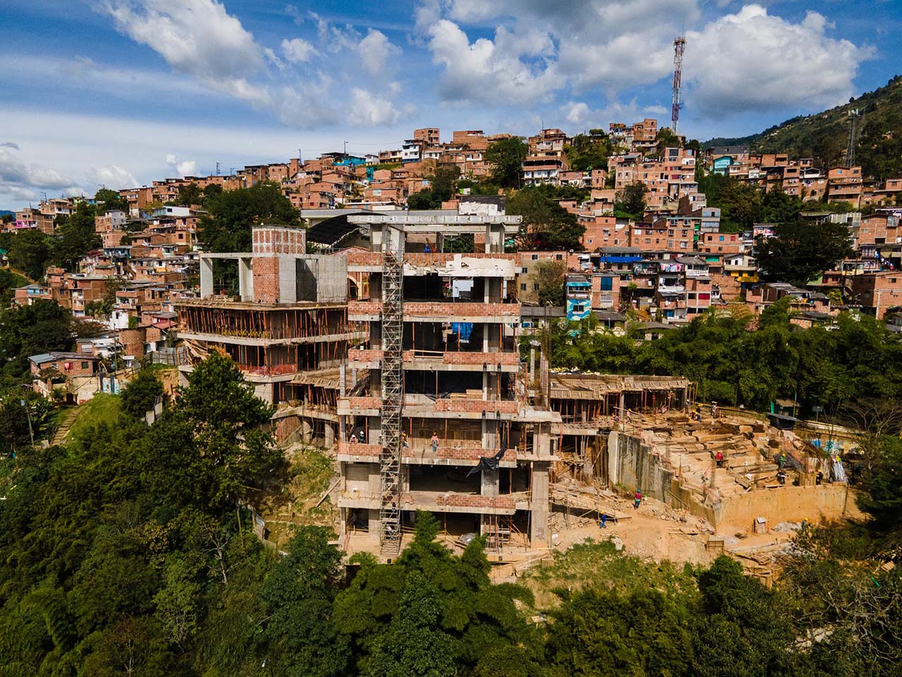 • A toda marcha avanzan los trabajos de reconstrucción del Parque Biblioteca del barrio Santo Domingo, obra que la comunidad espera para recuperar la fe y continuar adelante con su proceso de transformación social y cultural.
