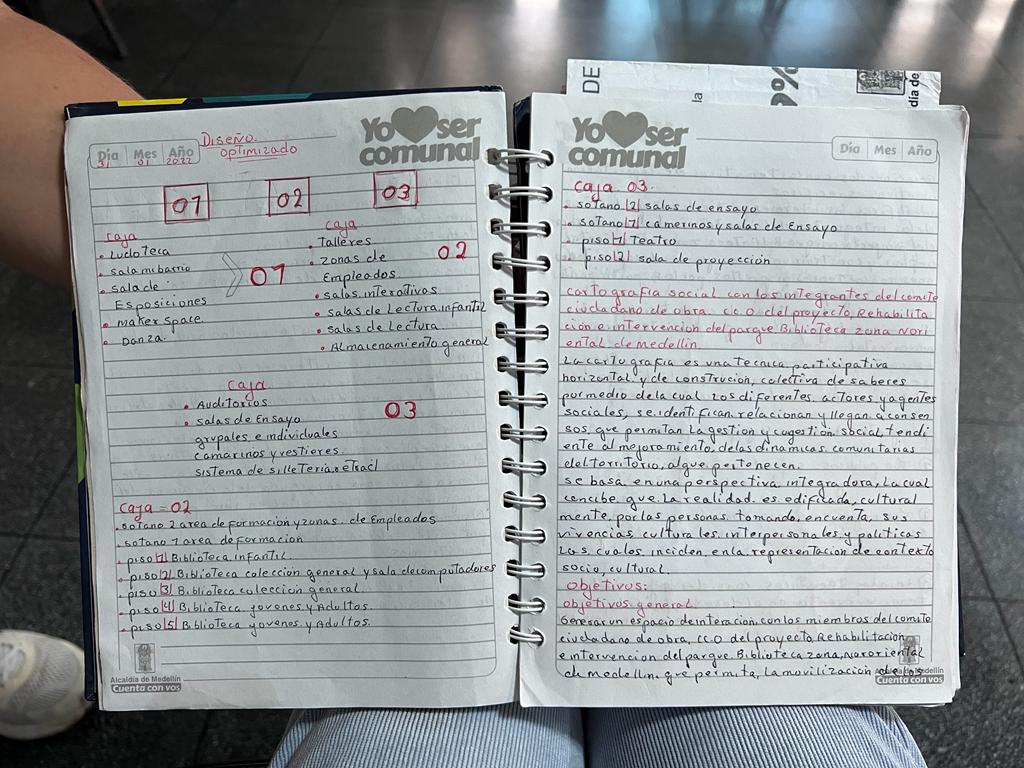 Con un cuaderno que siempre está bajo su brazo donde registra cada reunión y los pasos que se van llevando a cabo en la biblioteca, doña Maryul lleva detalladamente las fechas y compromisos que se fijan. De esta manera dibuja cada caja del parque y lo que cada una contendrá en su interior. Finalmente hace un cronograma de eventos futuros para informarle a la comunidad cómo va avanzando este gran proyecto y cuando sería su posible apertura, “mi sueño es ver de nuevo la inauguración, pero de algo bien organizado y terminado. Si Dios quiere para mitad de año está lista. Sueño con que la comunidad regrese a su biblioteca a disfrutar los espacios”.