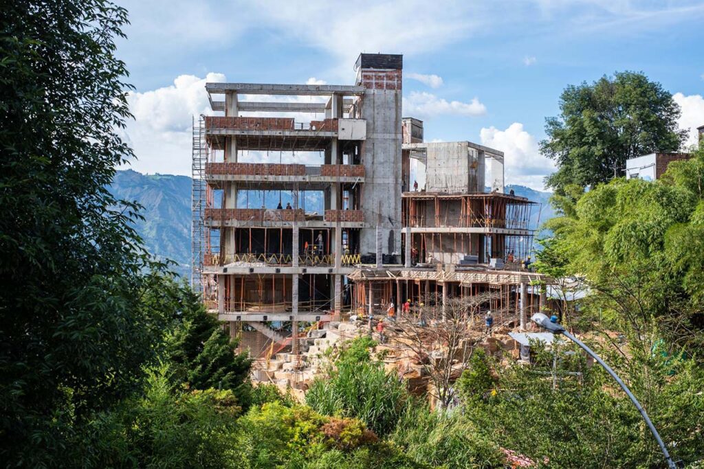 La enorme estructura negra que por varios años se erigió imponente sobre las empinadas laderas de la comuna Nororiental de Medellín, en el barrio Santo Domingo -conocida como Parque Biblioteca España- fue diseñada por el arquitecto barranquillero Giancarlo Mazzanti. Y lleva el nombre de ese país, porque fue justamente el gobierno ibérico quien ayudó a financiar el proyecto a través de la Agencia Española de Cooperación Internacional para el Desarrollo.