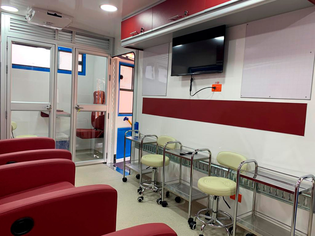 El vehículo tiene un espacio de 5 x 2.30 metros, con capacidad para atender tres pacientes simultáneamente. Los donantes en campañas extramurales contarán con un espa...