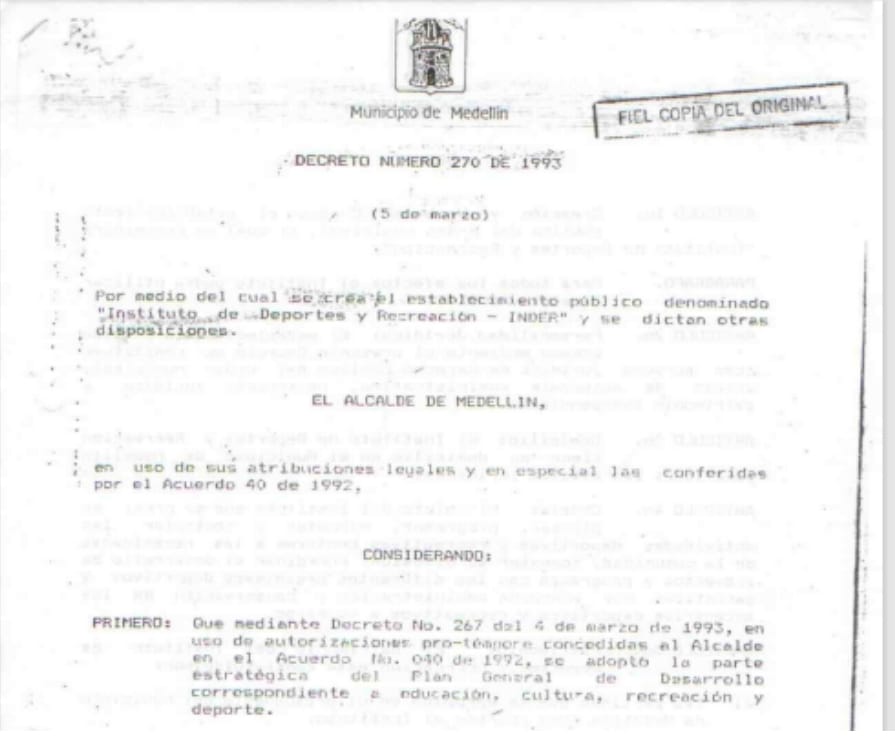 Fue el viernes 5 de marzo de 1993 la fecha en que nació por Acuerdo del Concejo Municipal el INDER Medellín -con diez empleados-. Posteriormente, la ley 181 de 1995 formalizó la creación de los Institutos de deporte a nivel municipal, dejando en firme este gran anhelo de la sociedad antioqueña.