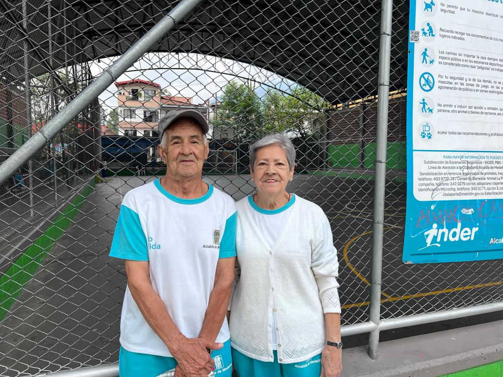 María Guillermina Vélez de Mejía de 82 años de edad y Luis Enrique Mejía Delgado, de 89 años, son dos esposos que hace un año visitan el programa Canas al Aire, en el corregimiento San Antonio de Prado, lugar donde residen. Todos los lunes, miércoles y viernes sin falta, no se pierden sus clases en la mañana, en la cancha polideportiva María Auxiliadora.