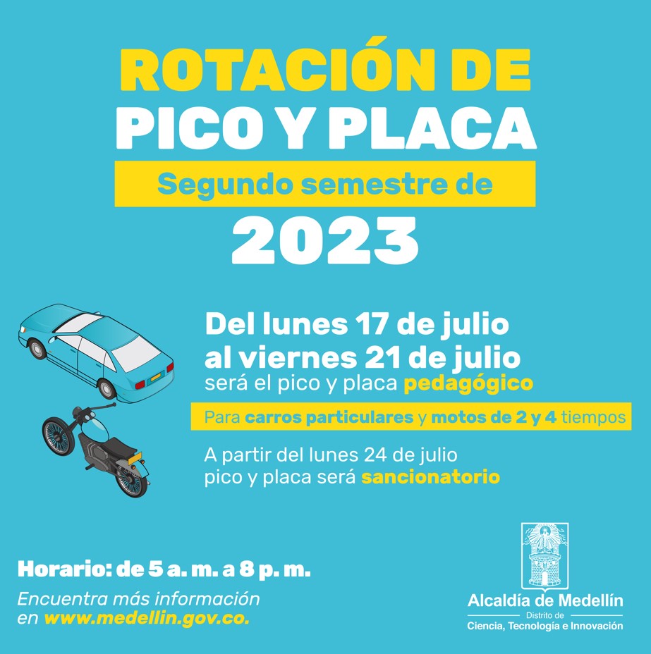 En Medellín el pico y placa rige a partir de las 5:00 a.m. hasta las 8:00 p.m. y aplica en todo el territorio urbano, exceptuando los cinco corregimientos. Es importante conocer que el incumplimiento de esta medida genera una multa de 580.000 pesos y la inmovilización del vehículo.