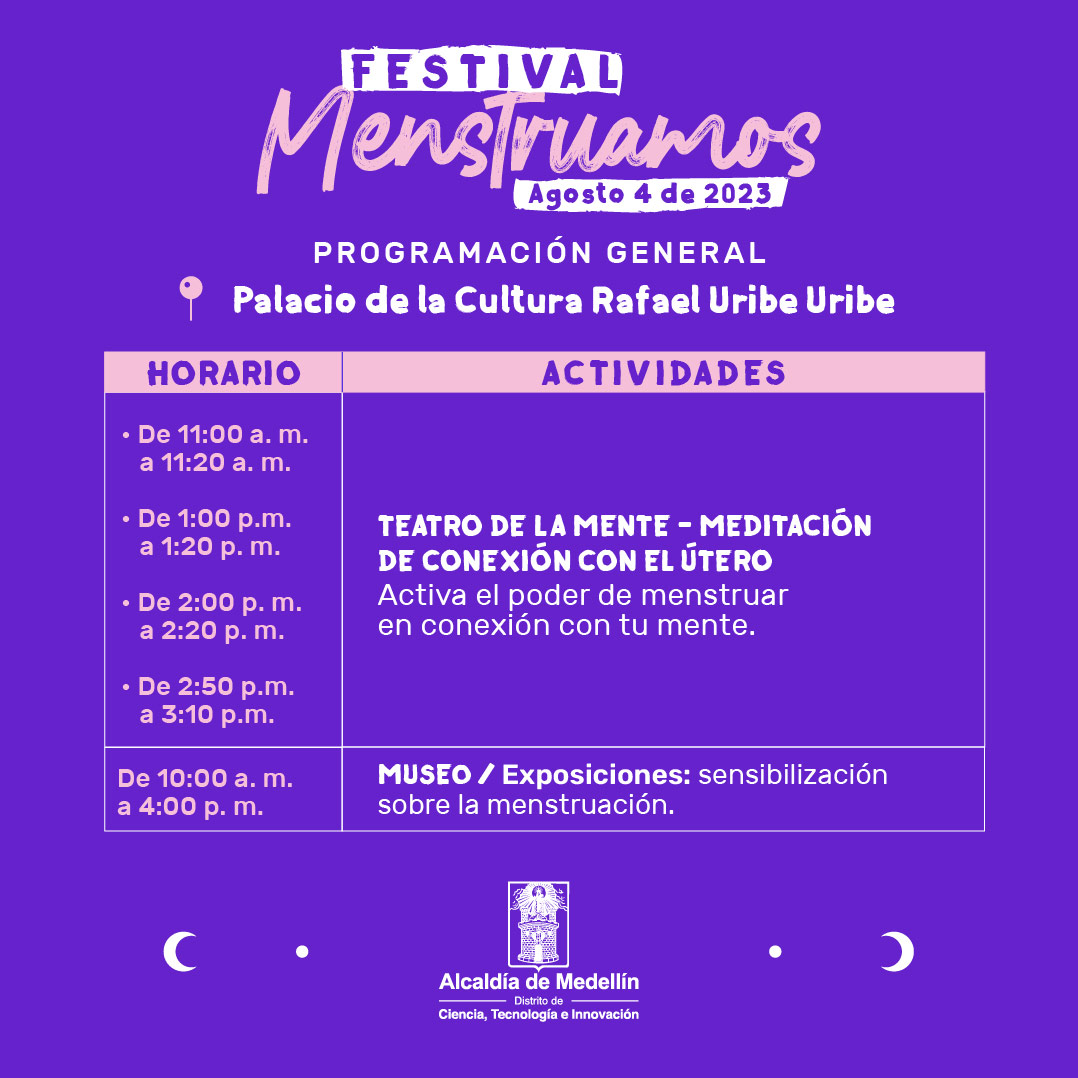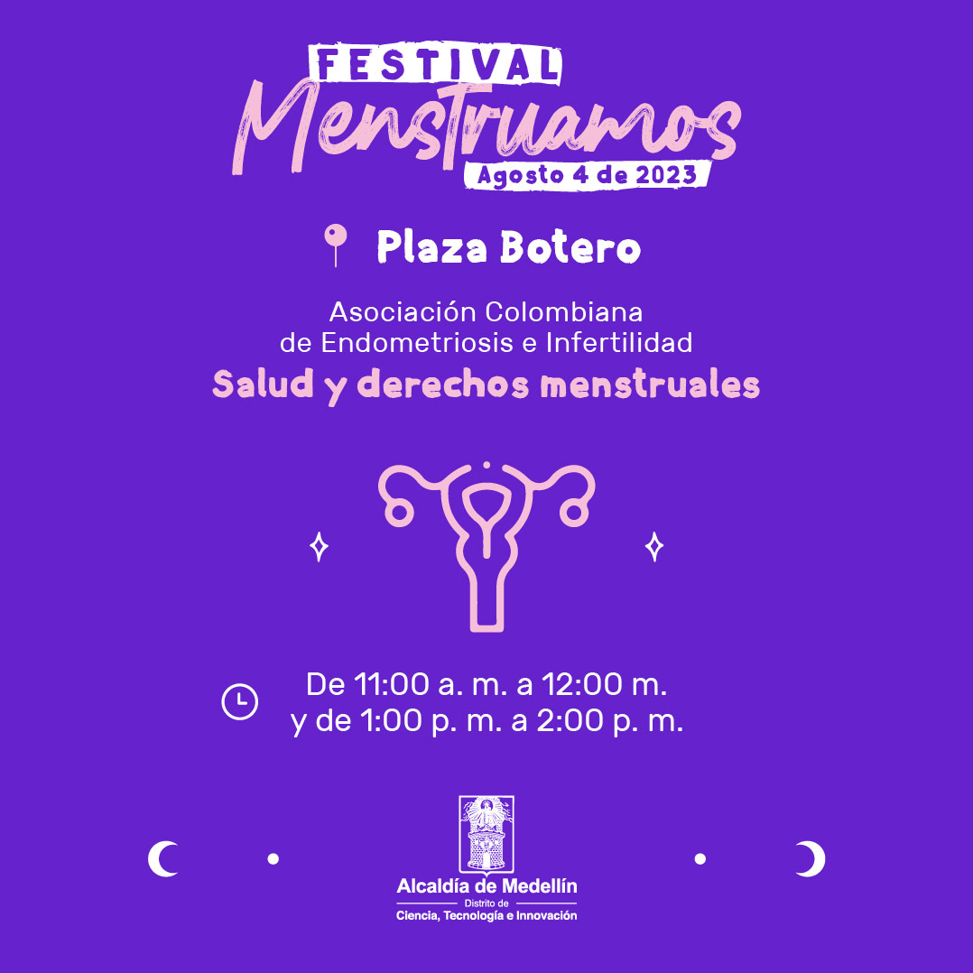 “En Medellín somos pioneras en reconocer que menstruar dignamente es un derecho y queremos que todos seamos parte de este camino, para que no tenga vuelta atrás. Por eso, te invitamos a que participes en la tercera edición de ‘Menstruamos’, el único festival de salud menstrual con recursos públicos en nuestro país. Nuestra consigna será Menstruación + Derechos = Dignidad. Será una fiesta para seguir celebrando este logro político de hacer de Medellín una ciudad dignamente menstruante”, indicó la secretaria de las Mujeres, Angélica Ortiz.