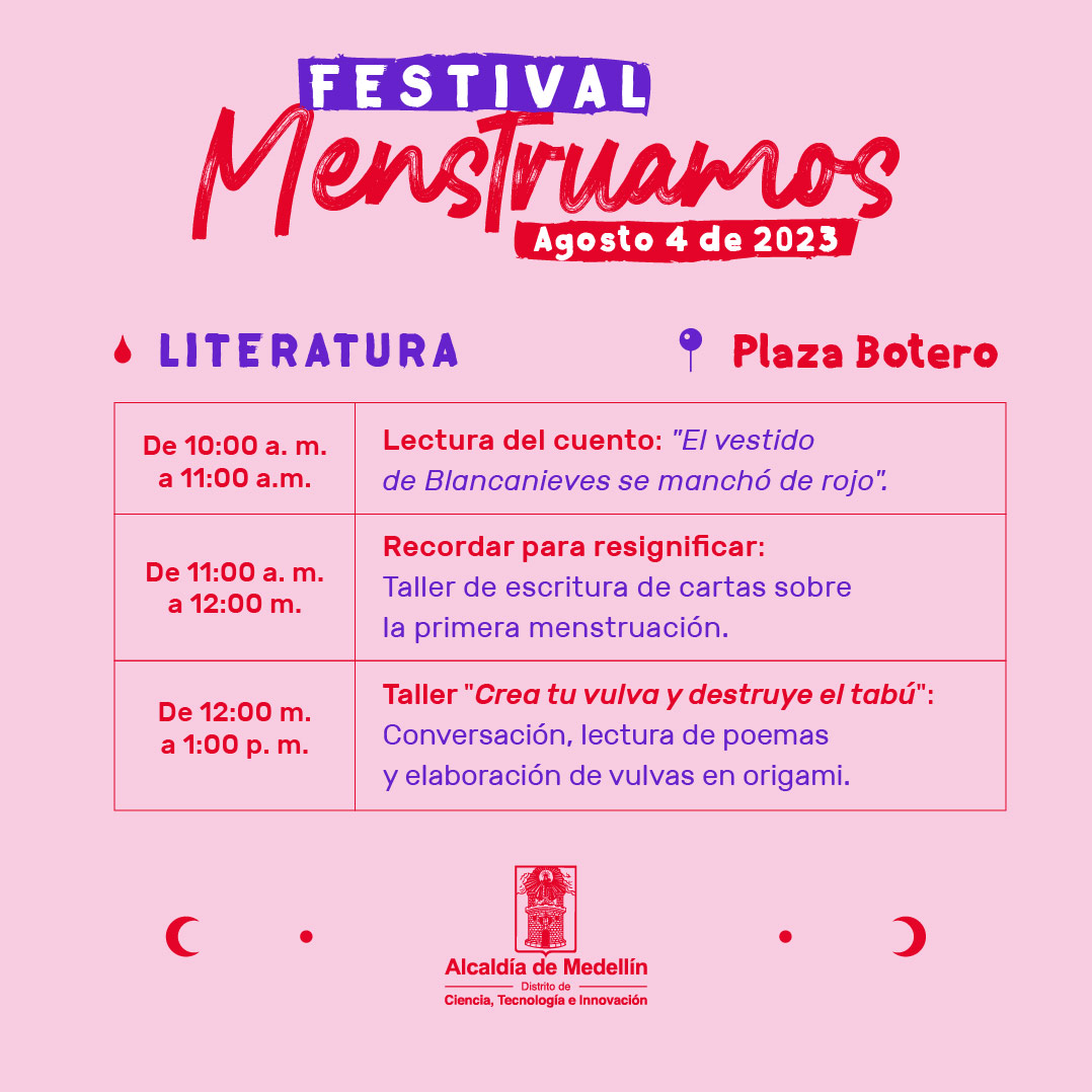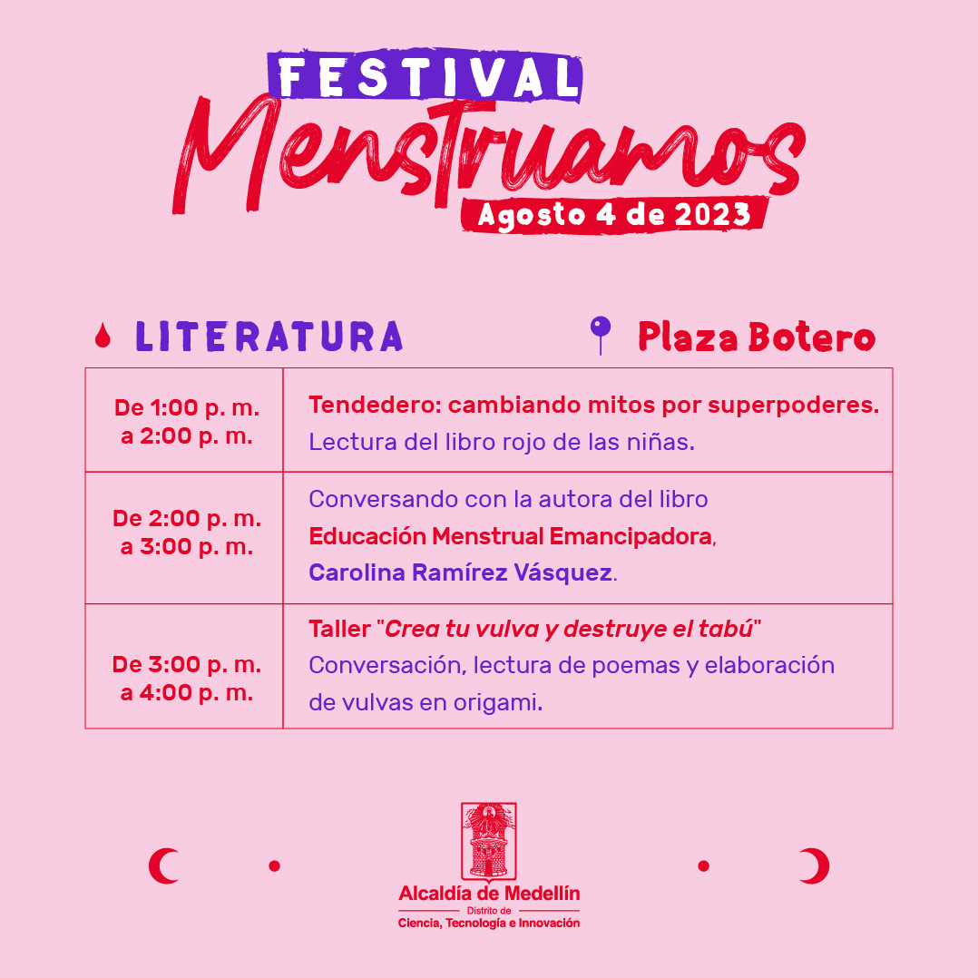 La programación cuenta, además, con un espacio literario para dignificar y naturalizar la menstruación, el cual tendrá un taller de escritura de cartas sobre la menarca, denominado “Crea tu vulva y destruye el tabú”; El tendedero: cambiando mitos por superpoderes; y un diálogo con Carolina Ramírez Vásquez, autora del libro Educación menstrual emancipadora.