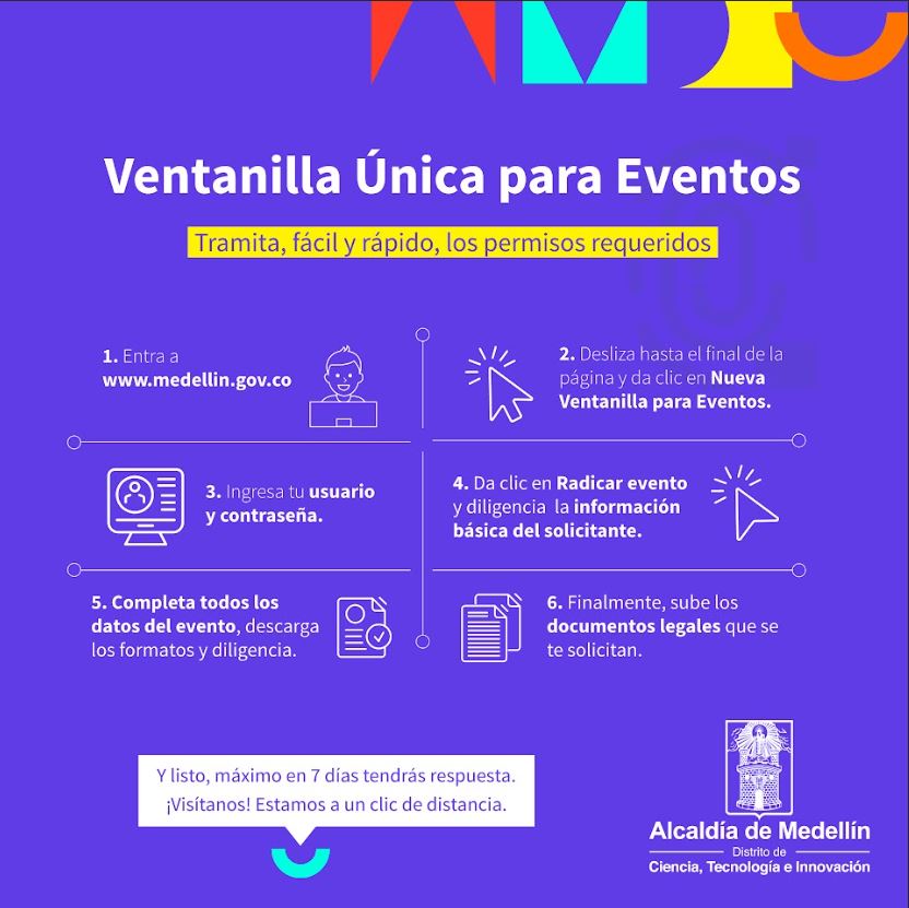 A través de herramientas prácticas como la Ventanilla Única Virtual para eventos, la Alcaldía de Medellín proporciona soluciones, ágiles y eficientes que se traducen en ahorro de tiempo, desplazamiento y dinero a las personas naturales y jurídicas que necesitan adelantar este tipo de trámites, convirtiéndonos cada vez más en un gobierno digital, cercano y participativo.