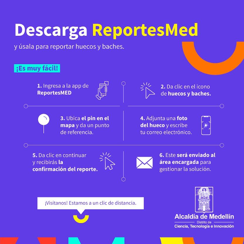 ReportesMED es una aplicación gratuita al servicio de toda la ciudadanía, en la que pueden reportar los problemas más frecuentes de los barrios como son los huecos, pero además las basuras, semáforos dañados, ciclorrutas en mal estado, daños en luminarias, alumbrado público, contenedores de basura, ocupación irregular del espacio público y vehículos mal parqueados. Aquí te explicamos como usarla: