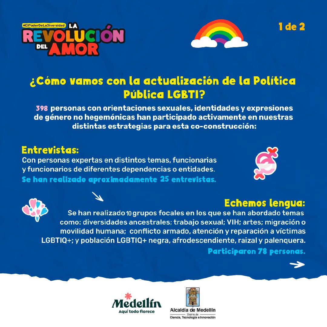 Actualmente se está llevando a cabo el proceso de evaluación y actualización de la Política Pública LGBTI del Distrito Especial de Ciencia, Tecnología e Innovación de Medellín; liderado por la Gerencia de Diversidades Sexuales e Identidades de Género. Esta es una oportunidad para la participación de la sociedad en la interpretación de las realidades y necesidades concretas de las personas que se autorreconocen como parte de esta población.