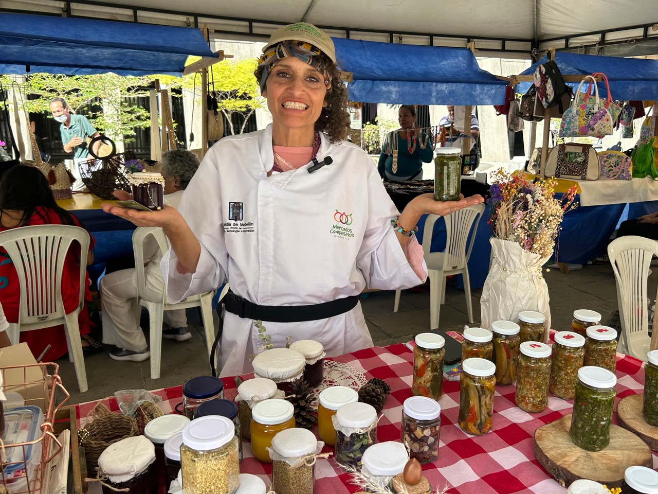 Los últimos días de cada mes, en la Plazoleta de La Alpujarra, 70 agricultores ofrecen sus productos. Hay quienes los llevan desde que inició el programa y otros se han unido en los últimos años, como Luz Marina Cardona: “Estamos promoviendo nuestros productos que son de Santa Elena. Son conservas; un rico y delicioso chimichurri con aceite de oliva extravirgen y un elixir de arándanos. Los invitamos a todos a que vengan acá a La Alpujarra, a comprar los productos de Mercados Campesinos”.