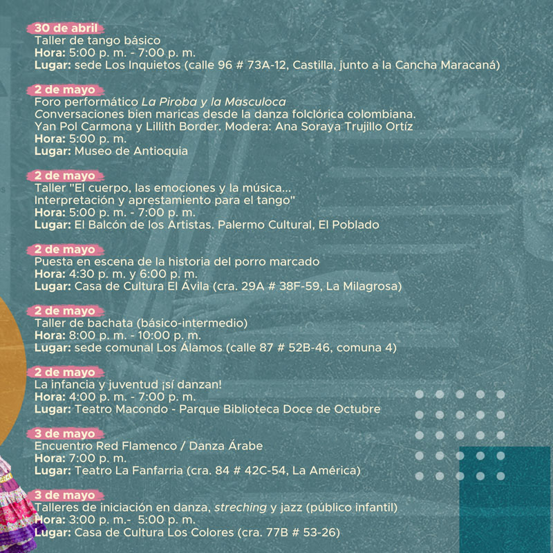 La danza clásica, el baile urbano, el ballet, el porro, la salsa, el tango, los bailes latinos y otros géneros tradicionales como el bambuco, se tomarán espacios como instituciones educativas, la UVA de San Antonio de Prado, la Casa del Teatro de Medellín, centros comerciales, casas de la cultura, el Museo de Antioquia, entre otros, con el objetivo de acercar esta expresión artística a nuevos públicos, fortalecer los procesos de formación e impulsar el talento local.