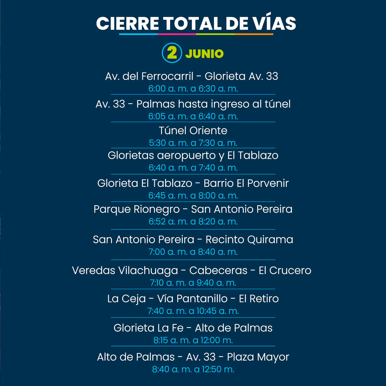 Este domingo, 2 de junio, se cumplirá uno de los eventos más importantes para ciclistas recreativos del país: Ruta Medellín. El certamen tendrá un recorrido de 109 kilómetros: saldrá del Edificio Inteligente de EPM, subirá por Las Palmas, Túnel de Oriente, Rionegro, San Antonio de Pereira, La Ceja, vereda Pantanillo, El Retiro, Carrizales, de nuevo Las Palmas y terminará en Plaza Mayor.