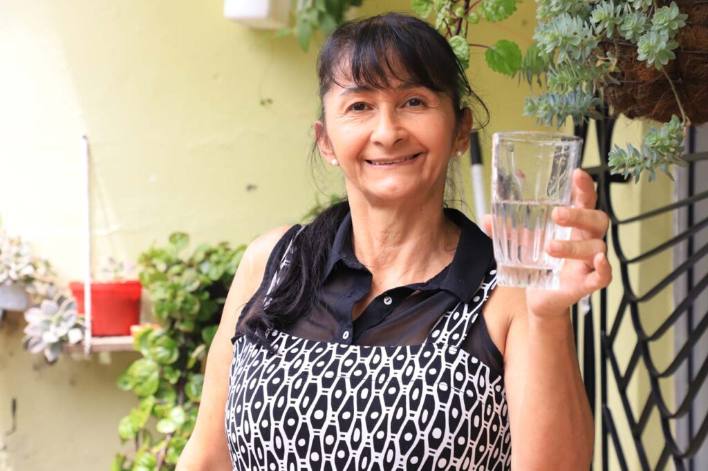 Luz Amparo es una beneficiaria comprometida con el cuidado del agua por eso sigue una rigurosa rutina para ahorrar cada gota en su hogar: lava la ropa una vez a la semana, la deja en remojo y la enjuaga en recipientes para aprovechar el agua sobrante en el baño y el aseo de la casa. Recoge el agua lluvia para regar las plantas, cuando se cepilla los dientes cierra la llave y el hielo que se descongela de la nevera lo usa para limpiar.