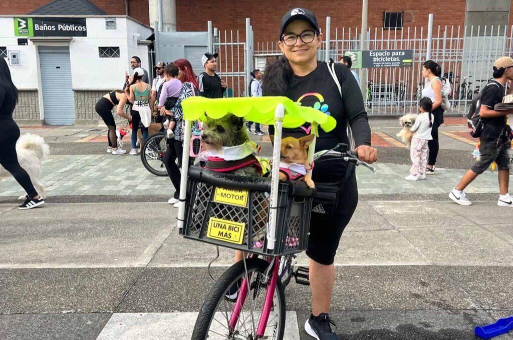 Al principio, clima fresco y cielo nublado. Jackeline Correa llegó desde el barrio Cristo Rey de la comuna 15 -Guayabal- en su bicicleta y en la parte de adelante una canasta con Lina Correa y Amor Correa, dos perritas criollas vestidas de negro y blanco, cual silleteras.