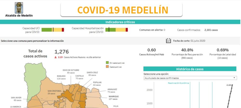 La plataforma, ubicada en el www.medellin.gov.co, dispondrá de información sobre los reportes diarios de coronavirus en la ciudad separado por casos activos en cada comuna o corregimiento, gráficos con el conteo del aumento de casos en la ciudad, el registro de nuevos casos por cada mil habitantes, etc.
