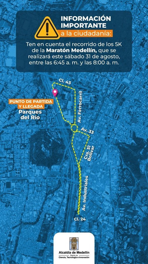 El primer cierre será este sábado para la distancia de 5K, desde las 6:00 a. m. y hasta las 8:00 a. m., en la que se calcula será la llegada a la meta. El recorrido inicia saliendo de Parques del Río hacia el norte por la calle 43, para dirigirse hacia el Oriente para alcanzar la carrera 45 y luego al Sur hasta la avenida 33, toma la carrera 51 para empalmar con la carrera 48, continúa al Sur por la calle 24 para tomar el retorno sobre la misma carrera48, luego la carrera 57 y tomar la salida a la glorieta de la avenida 33 hacia la carrera 62 y finalizar en Parques del Río.