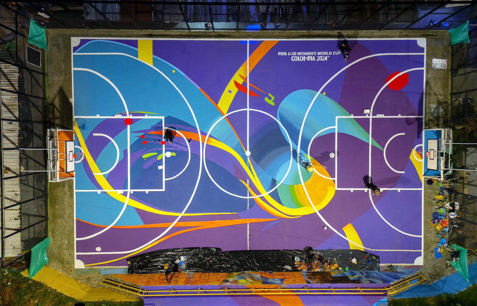 Jorge, ilustrador y muralista, llegó de Chinchiná, Caldas, para emprender este megamural en el piso de la cancha. El diseño con el que fueron elegidos consta de formas abstractas alusivas al Mundial. “Empezamos ayer con lavado y las primeras intervenciones”, dice este martes y agrega: “Hoy, a dibujar toda la mañana”.