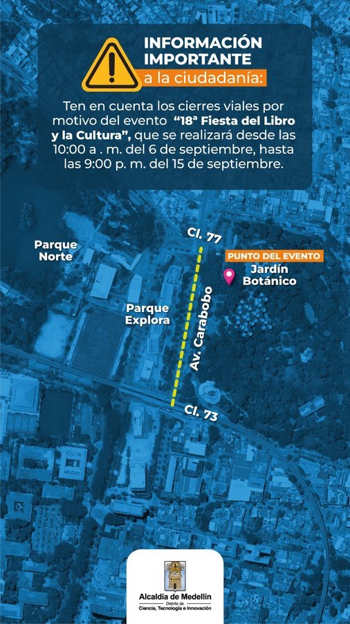 Estos cierres tendrán vigencia desde este viernes 6 de septiembre y hasta el 15 del mismo mes a las 9:00 p. m. sobre el tramo de vía de la carrera 52 (Carabobo) entre la calle 73 (bajos del metro e n la estación Universidad) y la calle 77 (parqueadero del Jardín Botánico).