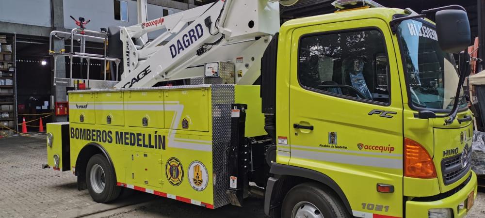 La Alcaldía de Medellín, a través del Departamento Administrativo de Gestión del Riesgo de Desastres – DAGRD, adquirió una nueva máquina tipo canasta para reforzar el componente automotor y salvamento en alturas del Cuerpo Oficial de Bomberos Medellín – COBM.