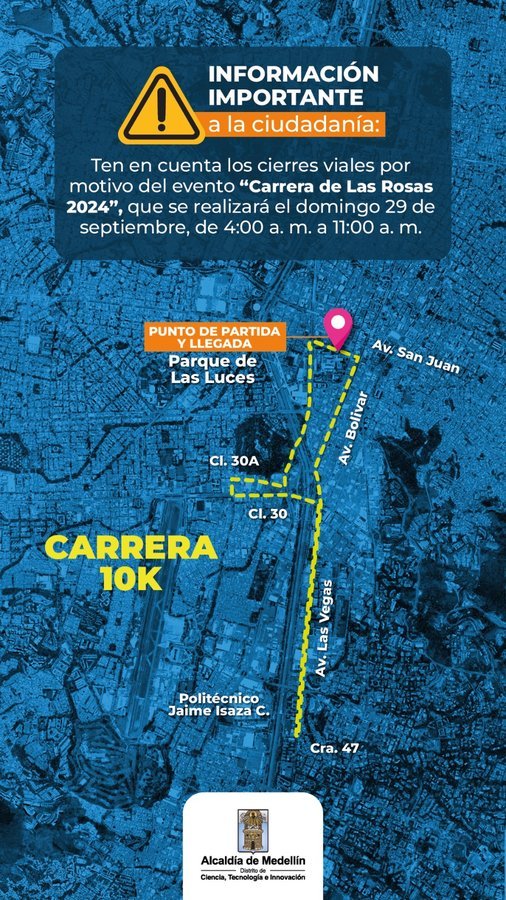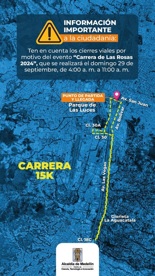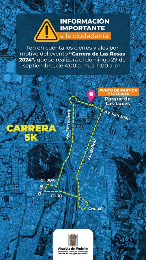 En varias vías de Medellín se aplicarán cierres para dar paso a la Carrera de las Rosas, que se realizará este domingo 29 de septiembre y que tendrá competencias atléticas y recreativas en recorridos de 21K, 15K, 10K, 5K y 2K. Se harán de manera escalonada, entre las 8:00 a. m. y las 11:00 a. m. Las restricciones iniciarán el sábado para el montaje de infraestructura y aspectos de logística.