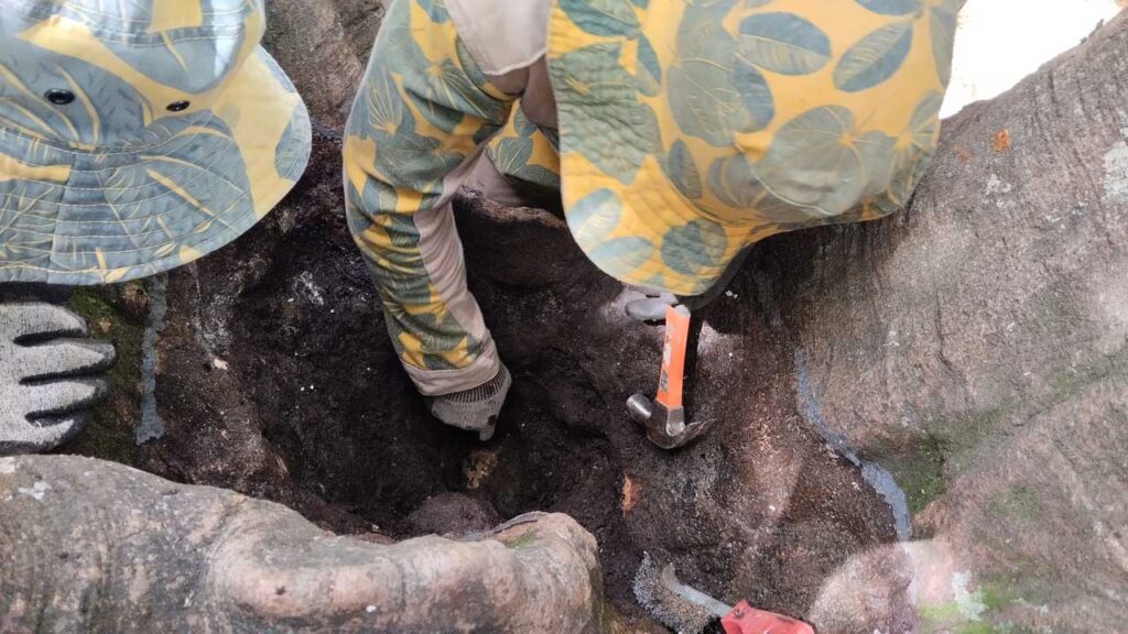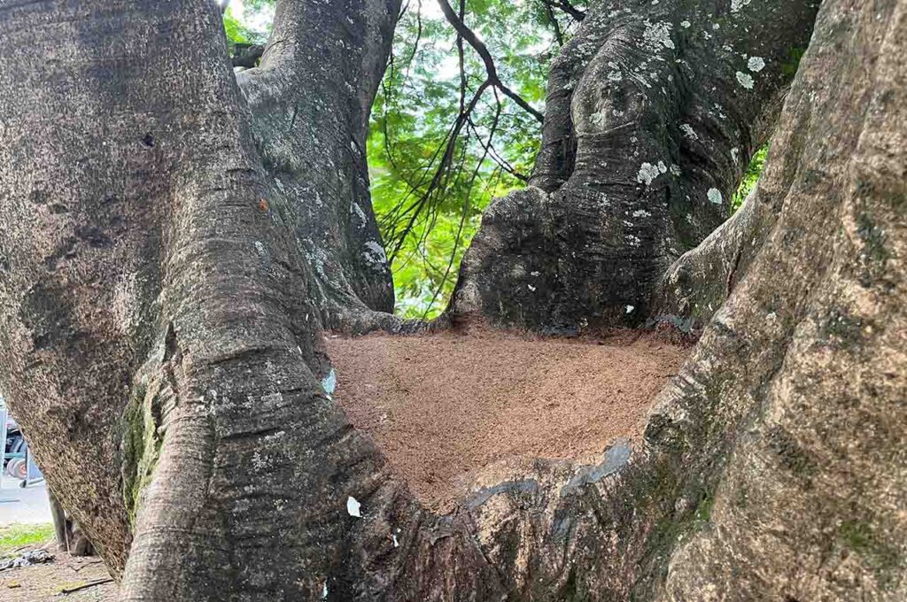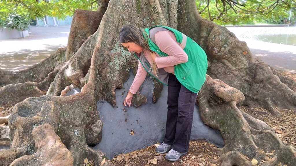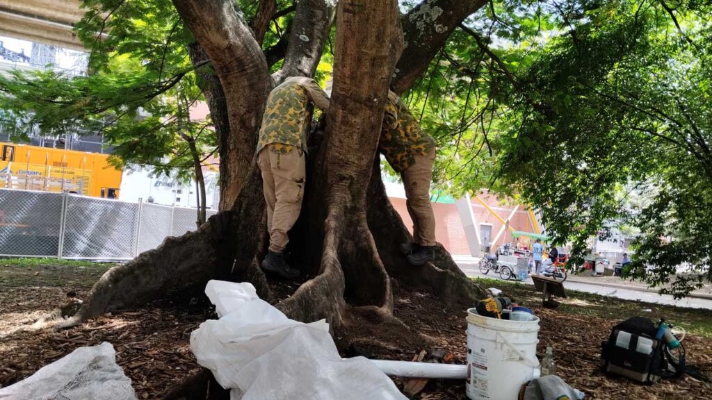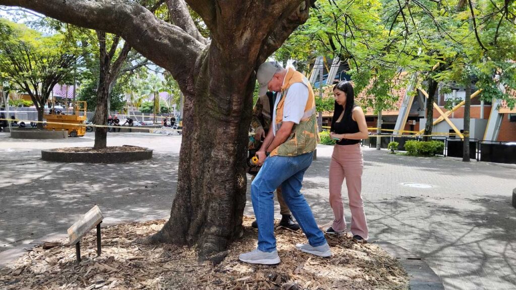 “Sí, estos árboles tienen también unos tratamientos especiales. Algunos de ellos son endoterapias, que es una inyección al árbol con un equipo que se llama Arborgel, y también tenemos unos procesos de dendrocirugías. Las dendrocirugías arbóreas consisten en tapar esas cavidades que tienen los árboles por daños mecánicos o por la misma fisiología, para evitar que por la humedad sigan llegando patógenos, y nos den pudriciones y enfermedades en los árboles. Entonces hacemos un proceso de raspado del tejido, unos rellenos, y por último lo que hacemos es que impermeabilizamos para que la humedad no vuelva a entrar y no se siga empeorando el problema. Ese proceso se hace permanentemente con los árboles, en el sentido de que tú le haces una dendrocirugía, pero hay que revisar que el proceso esté bien o se repite el mismo procedimiento en algunos árboles. En muchos de los árboles de nuestra ciudad tenemos que hacer estas dendrocirugías varias veces, porque son vandalizados. Hay personas de la comunidad que no saben de qué se trata, hacen excavaciones y dañan este proceso”.