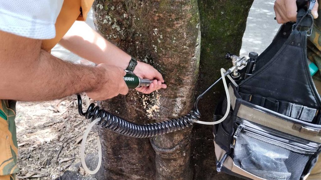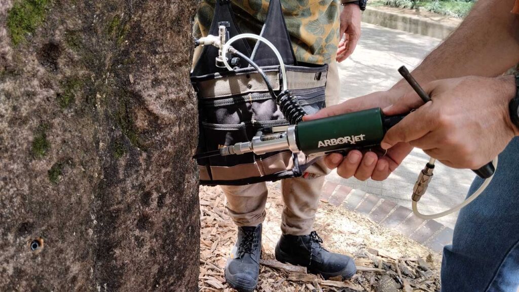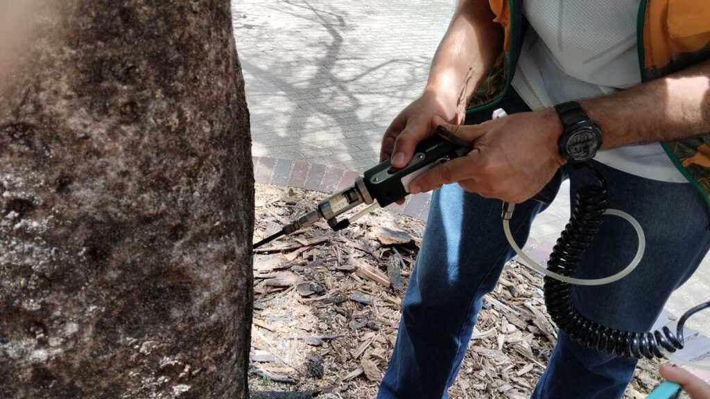 “La endoterapia es un proceso de inyecciones a los árboles, hay varios mecanismos para hacerlo. Nosotros tenemos un equipo que se llama Arborjet que hace unas inyecciones neumáticas dentro de los árboles. Son como inyecciones porque las inyecciones a nosotros nos entran medicamentos o nutrientes a las venas, entonces en los árboles el equivalente serían esas haces vasculares, que entran directamente y digamos que es más rápido y más eficaz. Eso lo hacemos con árboles que tienen algún tipo de enfermedad o nos están mostrando síntomas de secamiento, entonces muchas veces lo hacemos como control fitosanitario o como una fertilización, pero para que sea más eficaz directamente a las haces vasculares”.