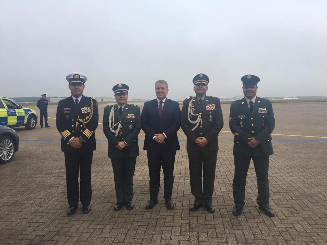 El presidente Iván Duque en el medio y el sargento mayor de comando Iván Mesa, último de izquierda a derecha.