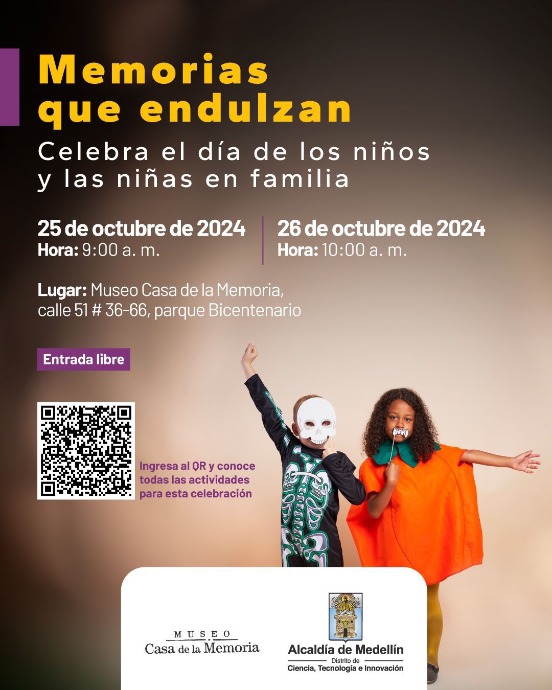 El viernes 25 y sábado 26 de octubre, el Museo Casa de la Memoria llevará a cabo «Memorias que endulzan», un espacio de entrada libre para toda la familia, dedicado a la construcción de paz y memoria. La agenda incluye actividades como la promoción de lectura, juegos inflables, talleres pedagógicos y presentaciones artísticas y culturales, que abarcan conciertos, teatro, cuentería y danza. Programación para el viernes 25 de octubre desde las 9:00 a.m. y el sábado 26 de octubre desde las 10:00 a.m.