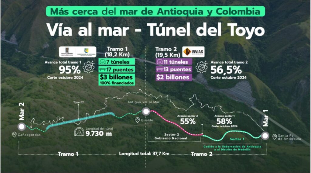 El proyecto Vía al Mar – Túnel del Toyo tiene una longitud total de 37,7 km y está dividido en