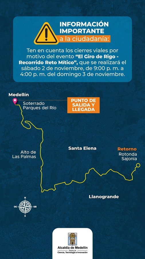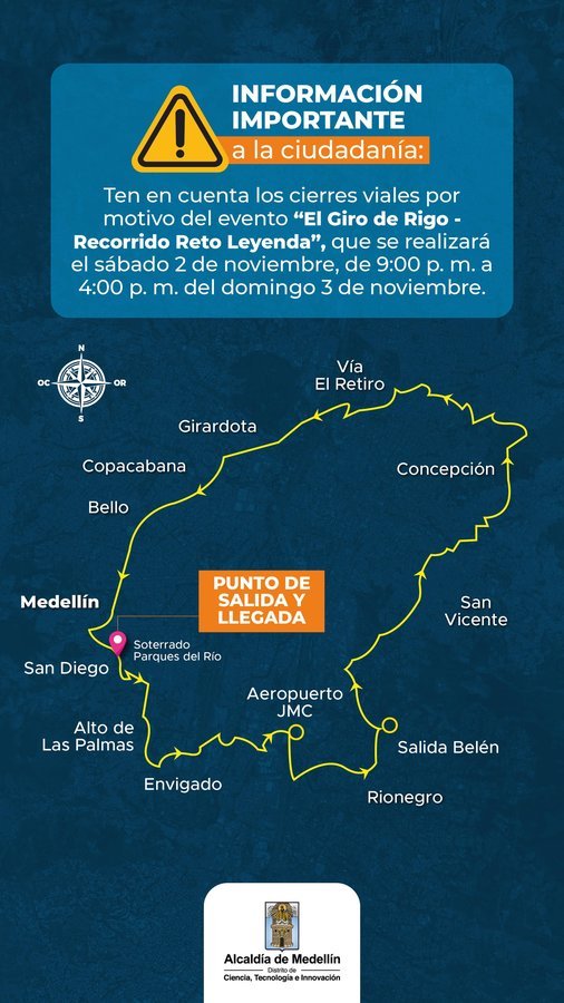 Este fin de semana, se aplicarán cierres viales con motivo del evento internacional ciclístico El Giro de Rigo, que reúne a más de 10.000 deportistas, quienes recorrerán Medellín, Envigado, Barbosa, Girardota, Copacabana, Bello, Rionegro, San Vicente Ferrer y Concepción.