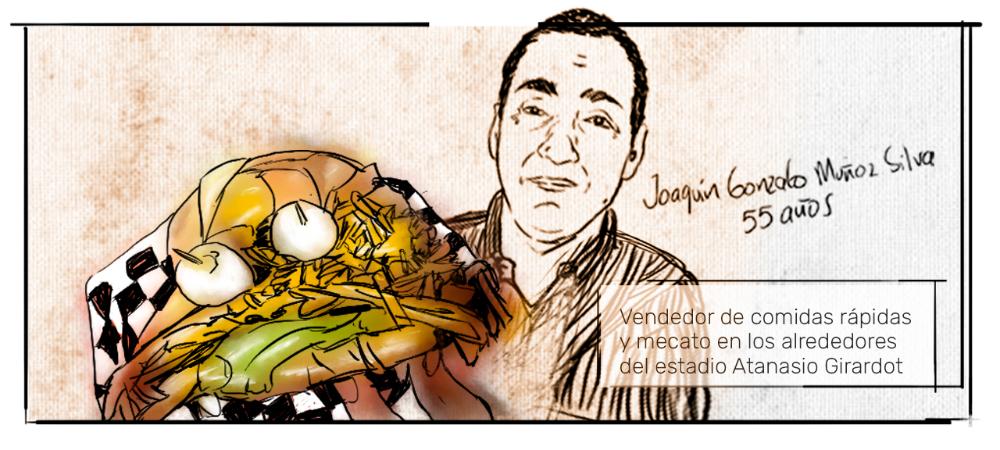 En otro lado de la ciudad habita Joaquín Gonzalo Muñoz Silva, con 55 años a cuestas. Uno de esos paisas alegres y optimistas. Desde muy joven, hace unos 40 años vendía en los alrededores del estadio Atanasio Girardot comidas rápidas y mecato y con eso ayudaba al levante de su familia en el barrio Niza, vecino de San Javier, al occidente de Medellín. Pero llegó el COVID-19 y con él la desolación. “Voy a dar vuelta por allá a ver qué se hace, pero ya no se vende”. Vive con sus tres hijos, el suegro y las respectivas esposas. “Me rebusco vendiendo arepas de chócolo, pero hay que caminarle mucho, desde las seis de la mañana hasta las doce del día y ahí me consigo algunos pesos”.