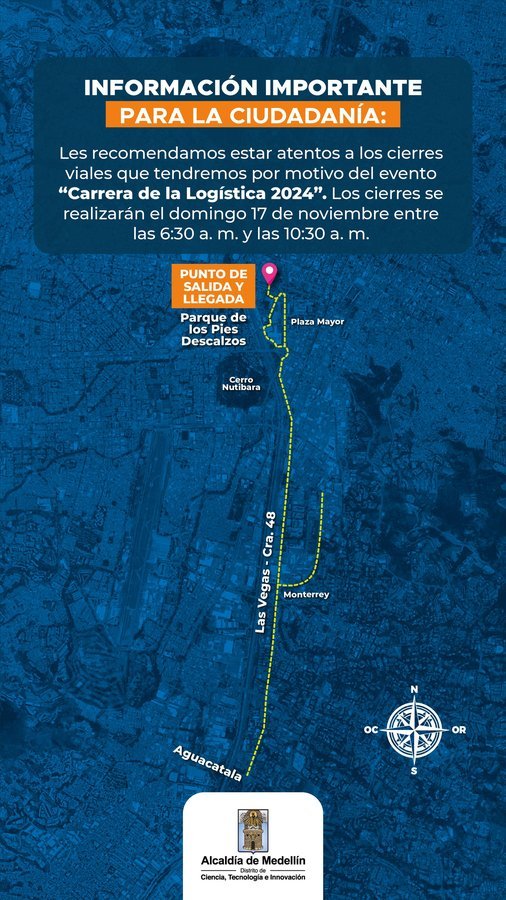 De igual manera, este domingo por la carrera de la Logística 2024 habrá cierre total en la carrera 58, entre las calles 42 y 42 A, desde las 6:00 p. m. del sábado hasta las 12:00 m. del domingo. Así mismo, para este evento se realizarán cierres totales y escalonados el domingo desde las 6:30 a. m. hasta las 12:00 m. con salida y meta de llegada en el Parque de los Pies Descalzos.