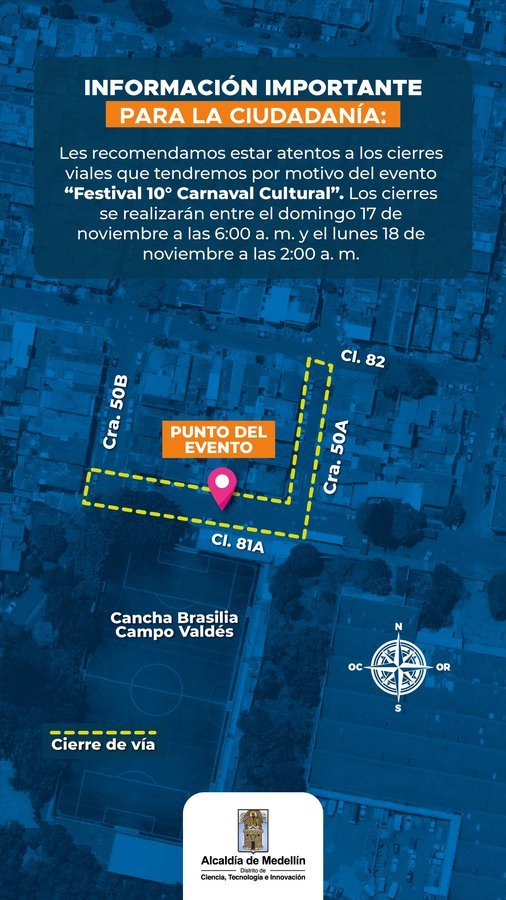El domingo, por el Festival #10 Carnaval Cultural Un Barrio de Comparsas y Bandas Marciales habrá cierres viales programados en la carrera 50 A entre las calles 81 y la calle 82; y en la calle 81 entre carreras 50 A y la carrera 50 B.