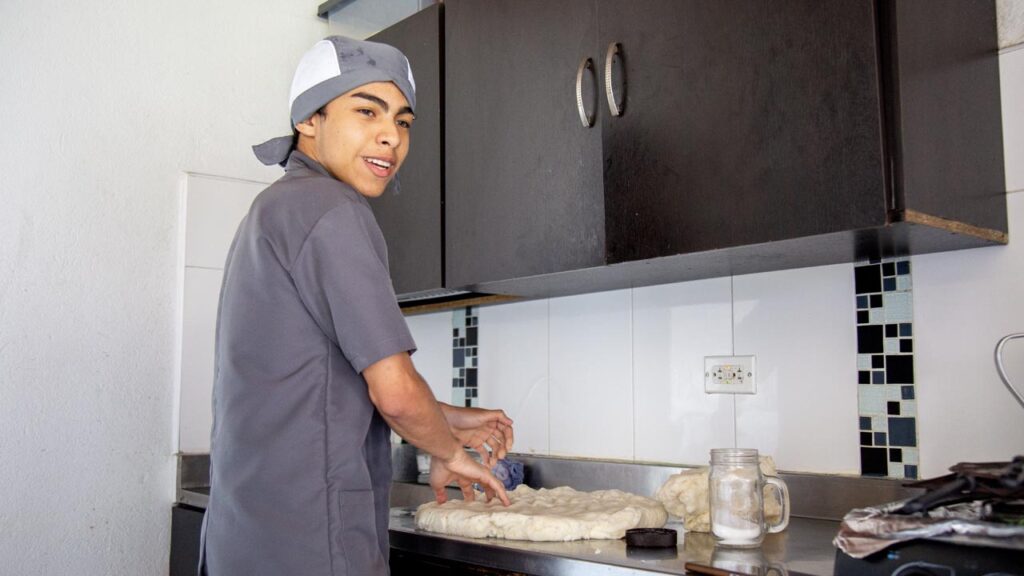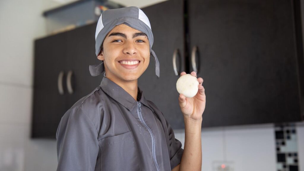 La historia de Mateo es un relato de lucha y aprendizaje. Su interés por la cocina empezó desde los cinco años, cuando lo inscribieron en cursos de pasta y repostería en Comfama, de los cuales no solo conserva el conocimiento, sino su gorro y la bata gris que sigue vistiendo. Hoy, cursa segundo semestre de Gastronomía y Culinaria en la Institución Universitaria Colegio Mayor de Antioquia, un sueño que alcanzó gracias al apoyo de los recursos del Presupuesto Participativo (PP) de Medellín,  que le cubren el pago de matrícula y el sostenimiento.