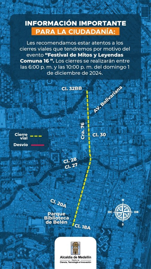 El tradicional Festival de Mitos y Leyendas de la comuna 16- Belén se hará entre las 6:00 p. m. y las 10:00 p. m. de este domingo 1 de diciembre y tiene cierres programados en la carreras 76 (calzada occidental) entre calles 18A y 27A, y en la carrera 76 entre calles 27A y 32BB.
