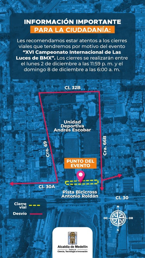 Por último, desde las 11:59 p. m. del lunes 2 de diciembre y hasta las 6:00 a. m. del domingo 8 de diciembre tendrá lugar el XVI Campeonato Internacional de Las Luces de BMX, para lo cual habrá cierres programados en la calle 30A entre carreras 66B y 69. La duración de este cierre incluye los tiempos de montaje y desmontaje del evento.