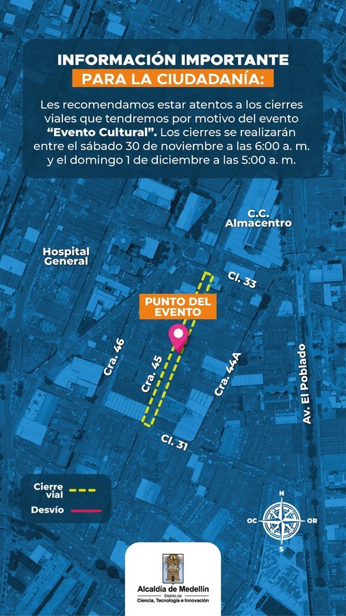 Este sábado desde las 6:00 a. m. y hasta las 5:00 a. m. del domingo 1 de diciembre, se realizará evento cultural y tradicional previo a diciembre, que tendrá lugar en el sector del Perpetuo Socorro de la comuna 10-La Candelaria. Para ello se tendrá cierre total de la carrera 45 entre calles 33 y 31.