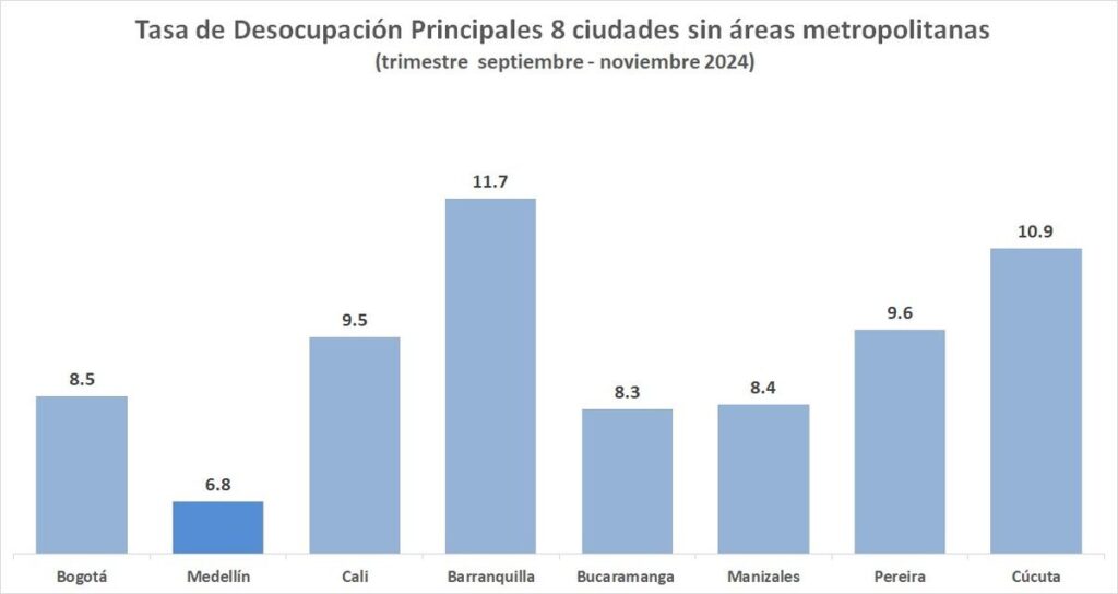 En el informe del Dane, a su vez, se presentan los indicadores de desocupación de otras ciudades colombianas: Bucaramanga, con 8,3 %; Manizales, 8,4 %; Bogotá, 8,5 %; Cali, 9,5 %; Pereira, 9,6 %; Cúcuta 10,9; y Barranquilla, 11,7 %.