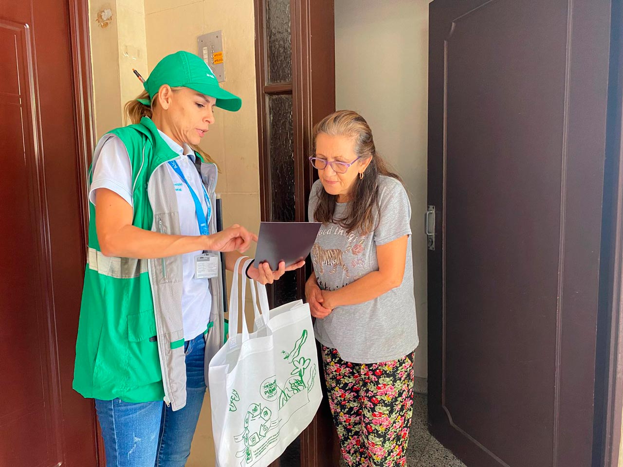 A cada hogar se le entregó un kit que contenía un imán para identificar a la organización de recicladores de oficio que opera en cada sector o barrio, un distintivo para relacionar los hogares que fueron sensibilizados y un paquete con bolsas de diferentes colores para que las familias aprendieran a identificar qué tipo de residuos le corresponde a cada uno.