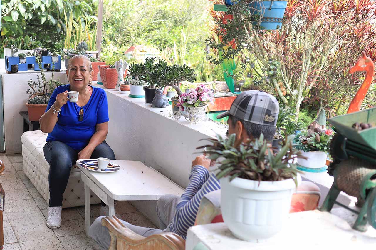 Compraron su casa hace 38 años y pasaron varios de estos adaptándola para que fuera el hogar soñado para sus cuatro hijos. En la parte trasera, un pasillo con un muro que se alza como haciendo de balcón, es la antesala de los cultivos. Al lado está “el parchecito”, como ellos llaman a la parte que convirtieron en salita, una mucho más pequeña y dotada con muebles de antaño, en la que pasan las tardes hablando de la vida y tomando café.