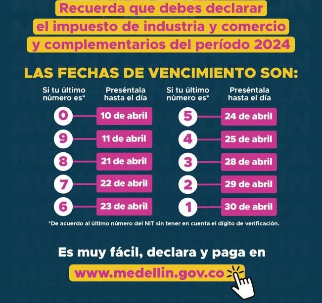 Desde el jueves 10 de abril inician las fechas de vencimiento para presentar la declaración del impuesto de industria y comercio en Medellín correspondiente al periodo gravable 2024, según el último dígito del Número de Identificación Tributaria (NIT), sin tener en cuenta el dígito de verificación.