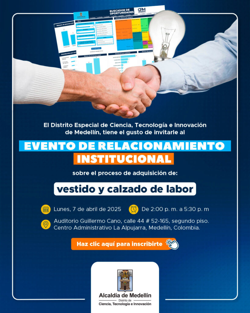El Distrito Especial de Ciencia, Tecnología e Innovación sobre Medellín realizará el primer Espacio de Relacionamiento Institucional, sobre el proceso de adquisición de vestido y calzado de labor.