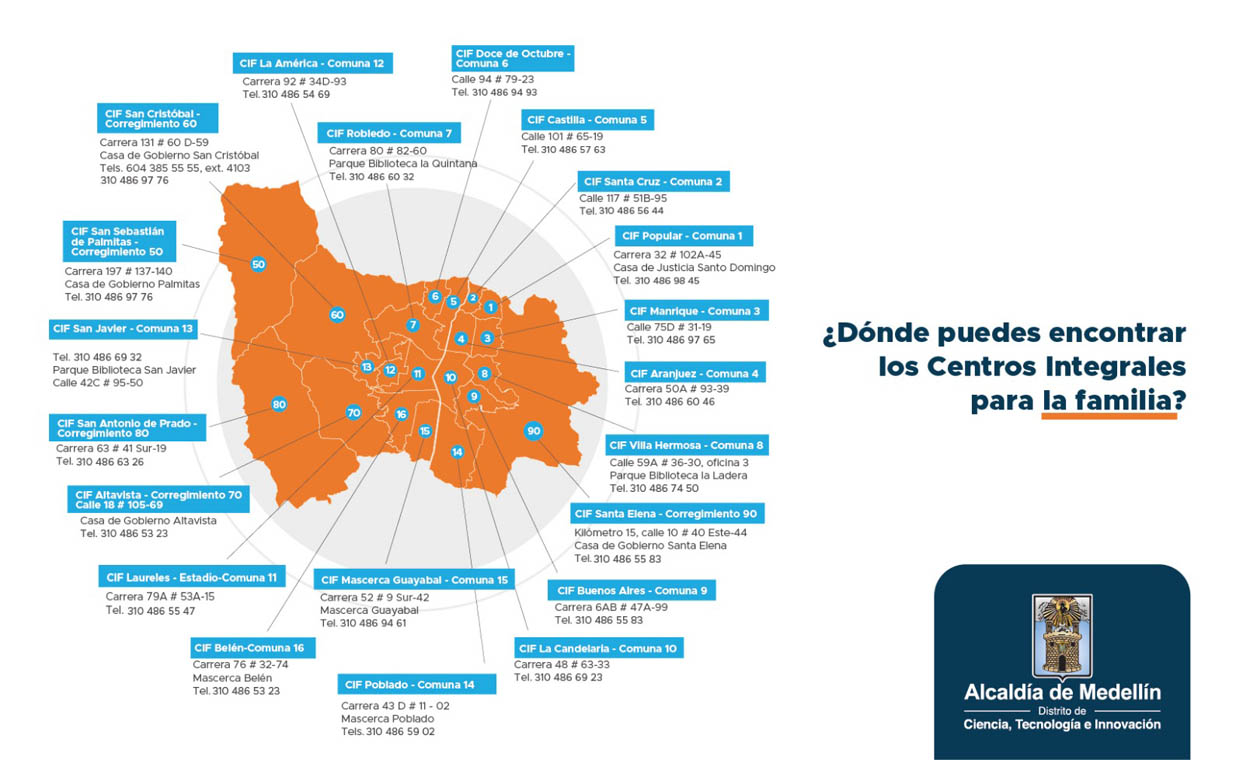 - Capacitación a cuidadores de personas mayores: con una duración de 120 horas, se realizará en las comunas: 2–Santa Cruz, 3–Manrique, 4–Aranjuez, 5–Castilla, 6–Doce de Octubre, 7–Robledo, 8–Villa Hermosa, 9–Buenos Aires, 10–La Candelaria, 11–Laureles, 12–La América, 13–San Javier, 14–El Poblado y 15–Guayabal; y en los corregimientos 50–San Sebastián de Palmitas, 60–San Cristóbal, 70–Altavista y 90–Santa Elena.