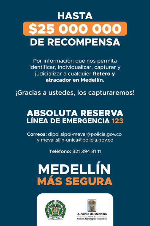 Los capturados quedaron a disposición de la Fiscalía General de la Nación por concierto para delinquir, hurto calificado y agravado. Las autoridades activaron una recompensa de hasta $25 millones por información que permita ubicar y judicializar a más integrantes de estructuras dedicadas al fleteo y al hurto violento en Medellín y el Valle de Aburrá.