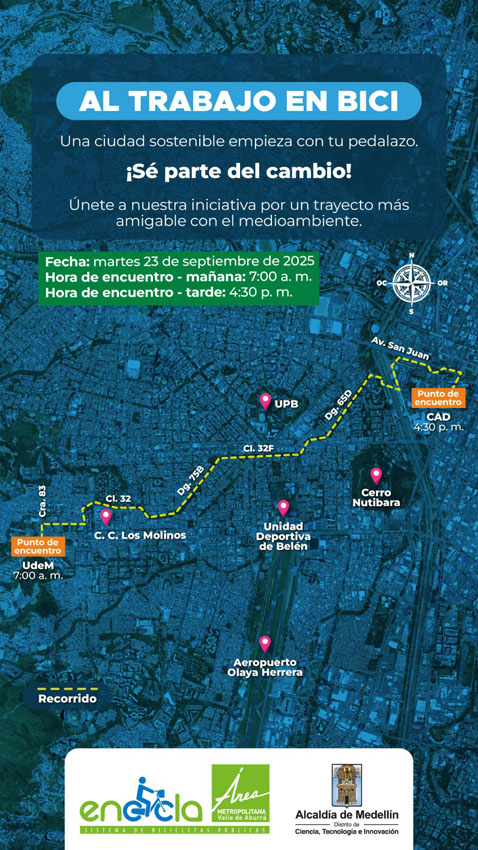 El evento contará, además, con el apoyo de EnCicla y el Inder, así como con la participación de entidades públicas ubicadas en La Alpujarra, entre ellas la Personería, la DIAN, Teleantioquia, el Palacio de Justicia y Plaza de la Libertad. Durante la mañana, los biciusuarios que lleguen al CAD serán recibidos en el biciparqueadero con incentivos entregados por la Secretaría de Movilidad y el Área Metropolitana, como una forma de reconocer su compromiso con esta causa.