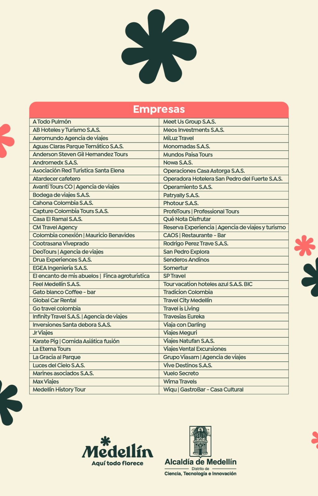 • El Distrito de Medellín informa que ya fueron seleccionadas las 68 empresas que harán parte del fortalecimiento tecnológico para el sector turístico de la ciudad. Esta etapa marca el inicio de una estrategia que busca consolidar a Medellín como un destino competitivo, innovador y sostenible a través del desarrollo de capacidades digitales, tecnológicas y humanas en los diferentes actores del ecosistema turístico.