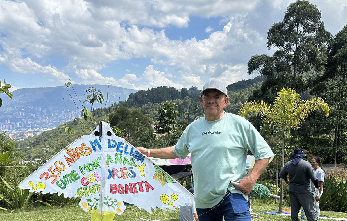 Alirio Quinchía, cometero del corregimiento hace 38 años, fue el ganador de la categoría “La de mejor mensaje”, con una cometa que describe “lo mejor de Medellín”, como él mismo lo definió: “350 años Medellín, entre montañas, colores y gente bonita”.