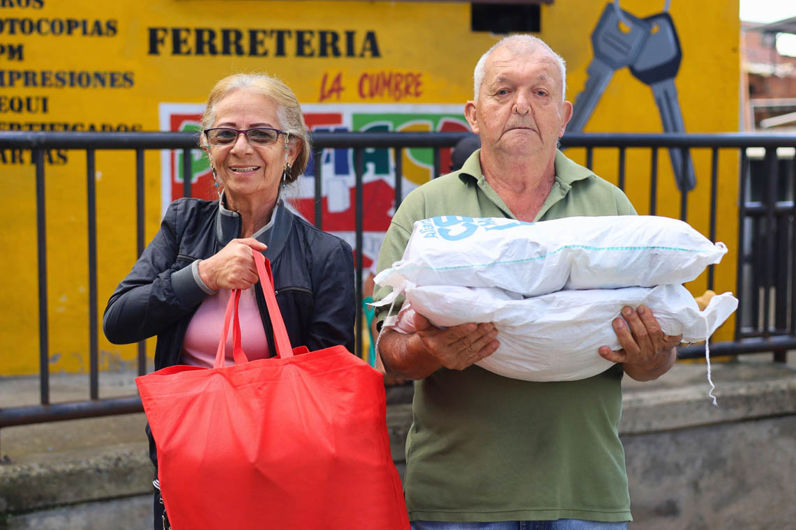 “Estamos recibiendo dos paquetes que nos sirven mucho en estos tiempos que estamos de vacaciones, porque la platica que nos dan haciendo un trabajito la invertimos en ropa y en otras cositas. Estos paquetes contienen fríjoles, arroces, aceites y huevitos. Eso es para nosotros fortalecernos y tener una vejez digna”, dijo el beneficiario Humberto Hoyos Betancur.