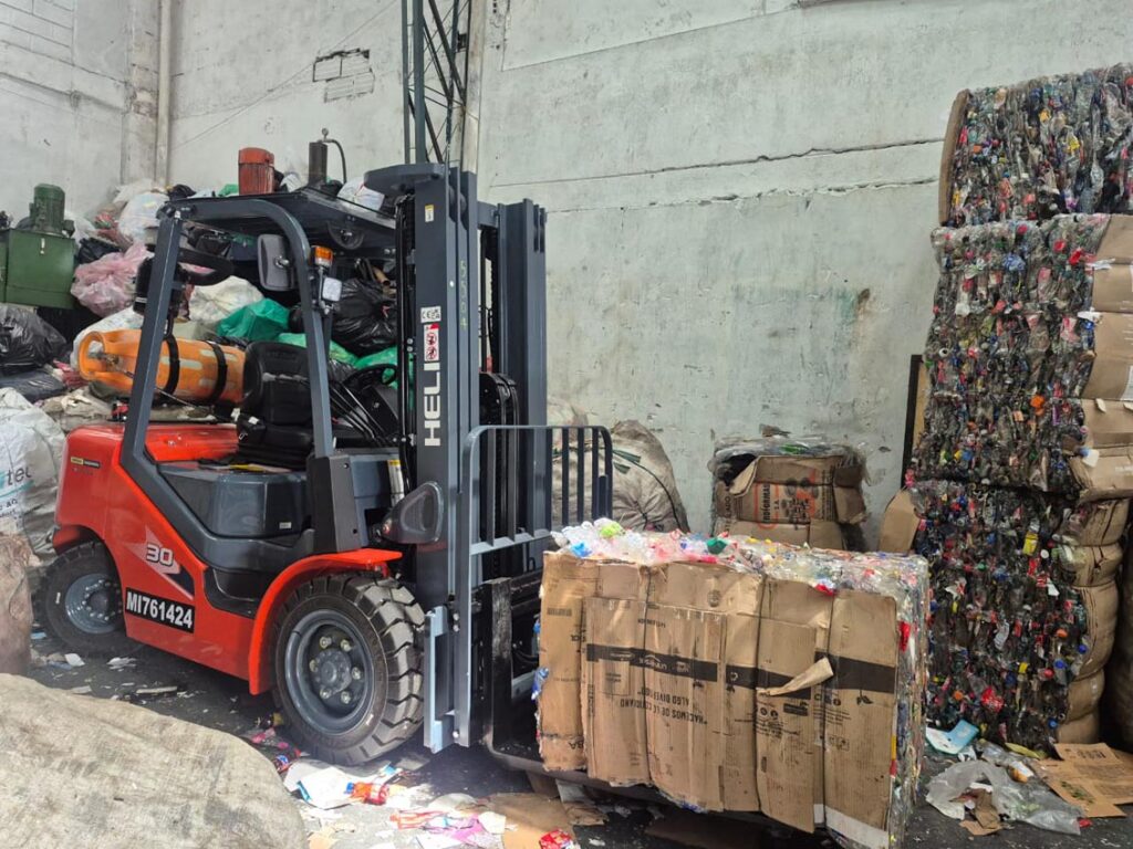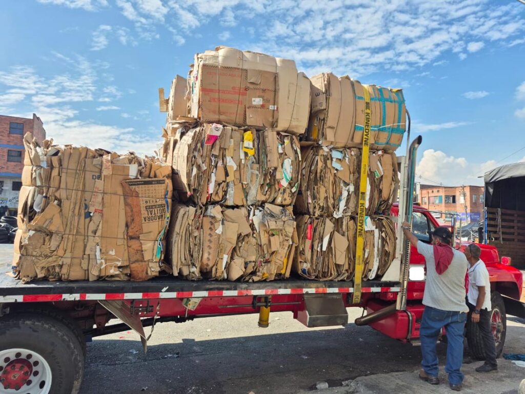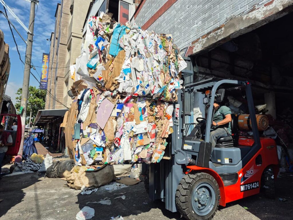Al salir de la oficina en la que conversamos se escucha el vallenato que suena abajo, en el acopio, mientras los operarios continúan con sus tareas. Uno de ellos compacta cartón en una máquina. Al lado está, apagado, el vehículo que les mejoró su labor en la bodega: el montacargas. Los trabajadores alistan las pacas que despachan en las mañanas hacia empresas que aprovechan de nuevo estos residuos en su producción. Así, la materia se reutiliza en un ciclo de protección del medio ambiente y economía circular.