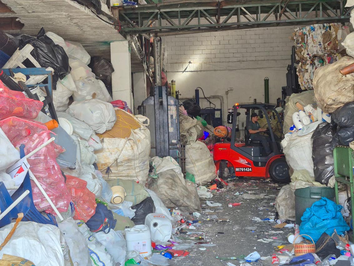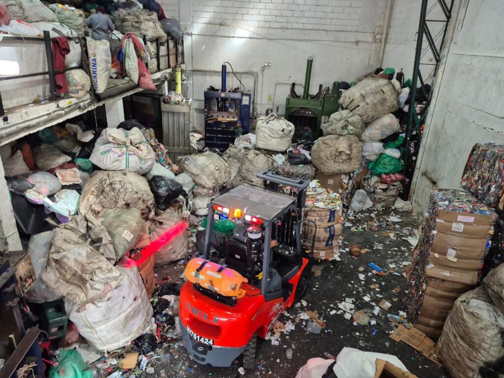 Bodega de la cooperativa Recimed. Al fondo, el montacargas levanta pacas de material reciclable
